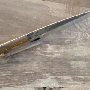 Voltar à lojaFaca estilo gaúcha, desenvolvida para o uso na cozinha, com empunhadura full tang, acabamento mostrando as marcas da tempera , 2 mm de espessura, fabricada em aço especial alto carbono, acompanhada de bainha, faca leve e de excelente manuseio